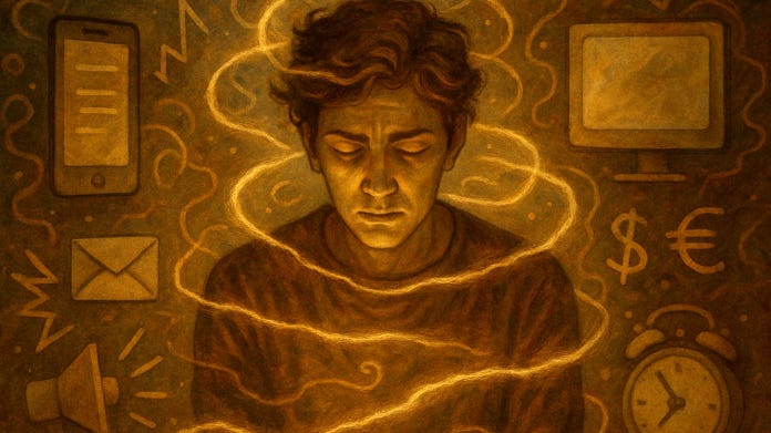 Modern life is saturated with noise, but hollow in meaning. Our devices pull at our attention like digital sirens, promising connection while stealing presence. The ritual of scrolling is the new prayer, the screen the new altar. We check our reflections not in water, but in curated feeds and algorithmic mirrors.